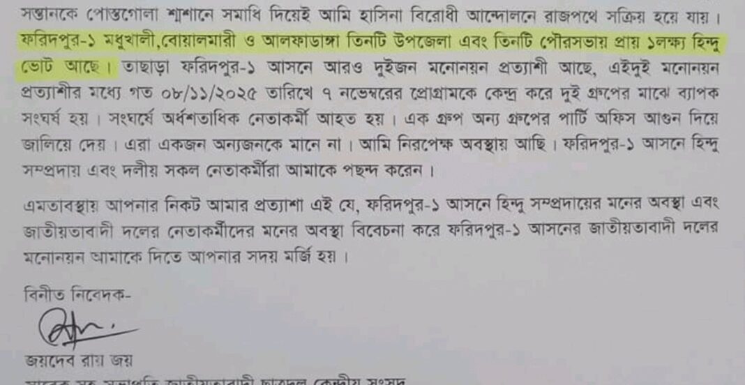 তবে লাখো হিন্দু অধ্যুষিত ফরিদপুর ১ আসনে জনপ্রিয়তার শীর্ষে রয়েছেন ছাত্রদলের সাবেক নেতা, হিন্দু বৌদ্ধ খ্রিস্টান কল্যাণ ফ্রন্টের সহসভাপতি ও বাংলাদেশ পূজা উদযাপন ফ্রন্টের সাংগঠনিক সম্পাদক জয়দেব রায় জয় বিএনপি ভারপ্রাপ্ত চেয়ারম্যান তারেক রহমানকে নির্বাচনে প্রার্থী হতে চেয়ে একটি টিঠি দিয়েছেন। তাতে তিনি লিখেছেন, ১৭ বছরে হাসিনা তার বিরুদ্ধে ৩৭টি মামলা করেছে এবং বহু বার জেল জুলুম খেটেছেন। পুলিশের গুলিতে পরিকল্পিত ভাবে খুন হওয়া খিলগাও ছাত্রদল নেতা জনি হত্যা মামলাতেও তাকে ২ নম্বর আসামি করা হয়েছিলো। পুলিশের নির্যাতনে মাথা, হাত-পা ভেঙ্গেছিলো বলেও চিঠিতে উল্লেখ করেছেন জয়দেব।